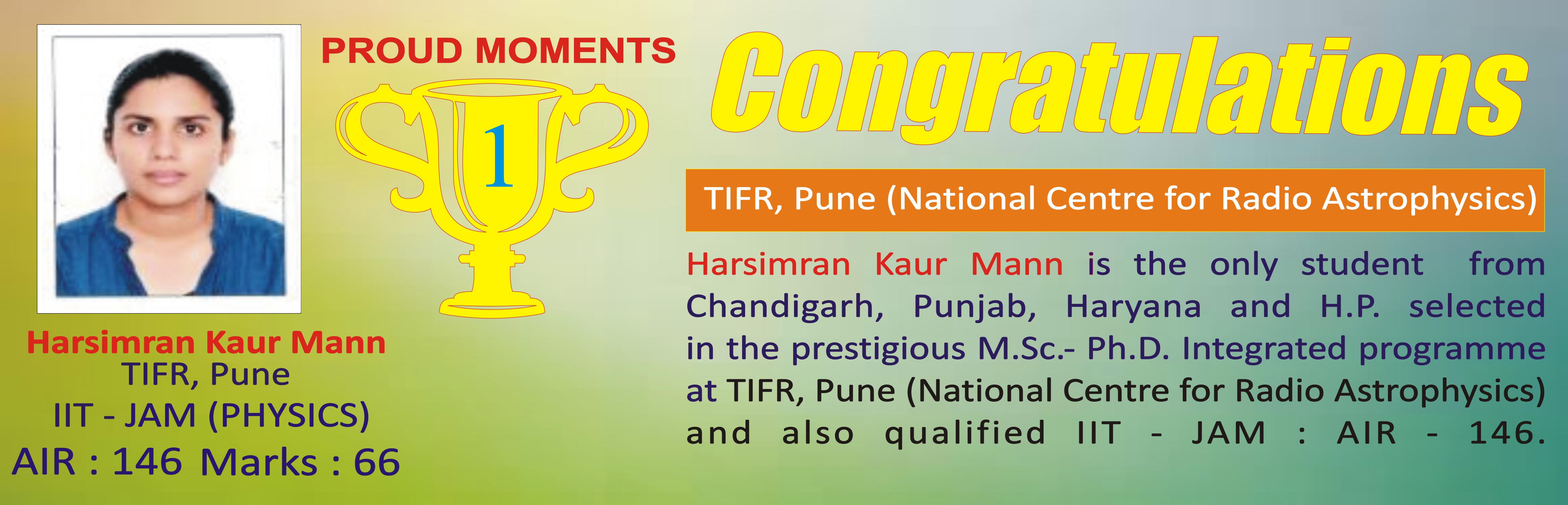 I am feeling proud to inform you that our student Ms. Harsimran Kaur Mann has been selected as research scholar for the prestigious Integrated Ph.D. Programme at National Centre for Radio Astrophysics, Pune – Tata Institute of Fundamental Research (NCRA-TIFR). Total 26 students are selected from all over India, whereas she is the only student selected from northern part of India i.e. Chandigarh, Punjab, Haryana & Himachal Pradesh etc. She has also made us proud by qualifying IIT-JAM (Physics) with AIR 146.